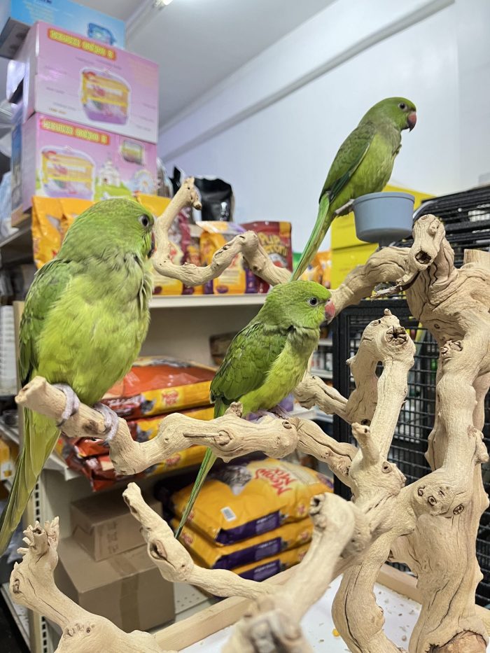 African ringnecks look quite similar to their Indian cousins, but whereas Indian ringnecks are a vibrant deep green, African ringnecks are more of a lime green. Also, the signature black ring around the male African’s neck is thicker and more prominent than that of the Indian variety. Conversely, the rose-colored ring is more prominent in the Indian ringneck. The Indian ringneck also has a larger red beak, whereas the African has a smaller plum-colored beak.
